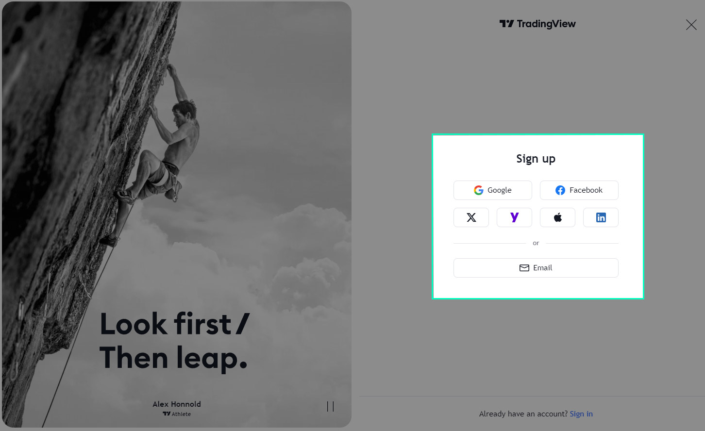 **Step 2:** Here, locate the "Sign Up" button at the top. Click on it – it's the first button – to create your free TradingView account.